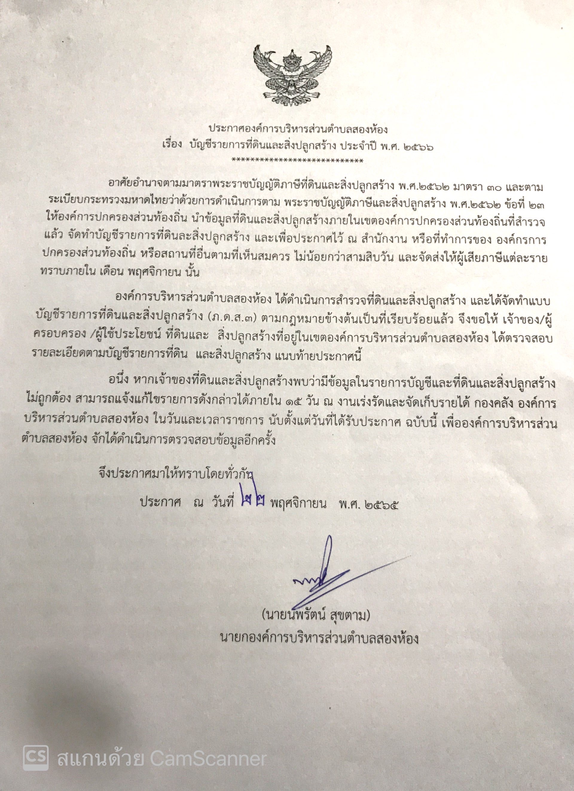 ขอให้ท่านทำการติดต่อ เจ้าหน้าที่เพื่อขอแก้ไขข้อมูลให้ถูกต้อง ภายในเดือน ธันวาคม พ.ศ.2565 นี้ เพื่อทางองค์การบริหารส่วนตำบลสองห้องจะนำไปเป็นข้อมูลในการประเมินภาษีในปีงบประมาณ 2566 ต่อไป
